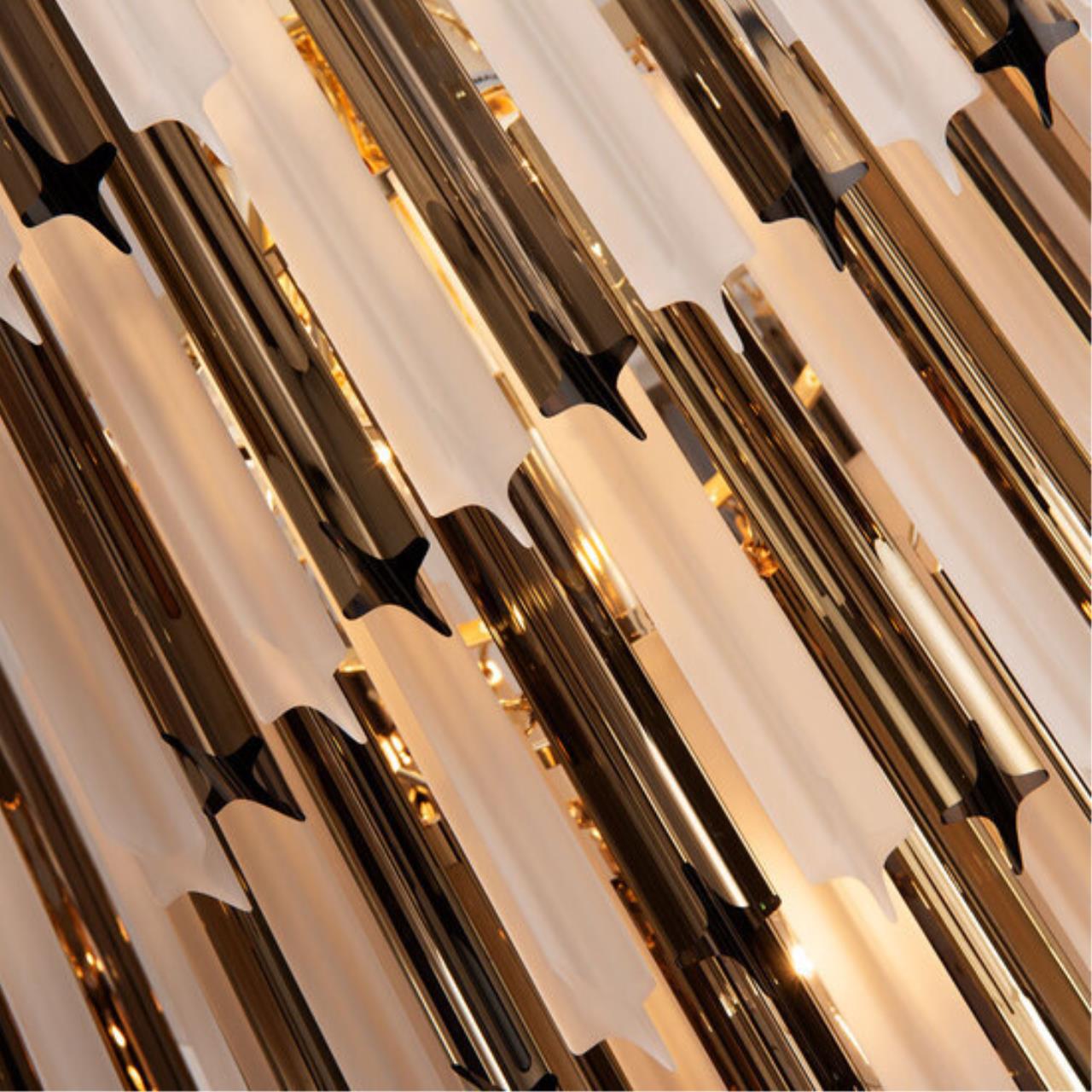 Роскошные люстры FRIZZANTE призваны украшать фешенебельные интерьеры. Свободно свисающие хрустальные декоративные элементы, расположенные в несколько рядов, образуют объемную конструкцию, которая при движении воздуха в помещении начинает «звучать». Сочетание золотых и матированных декоративных подвесок создаёт мягкий и воздушный образ модели. В коллекции три люстры разных размеров, есть возможность подобрать в помещения разных форматов. Большое бра может быть дополнением в ансамбль с люстрой, а может быть самостоятельным украшением интерьера.
