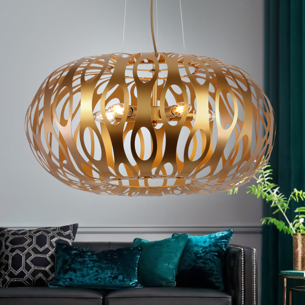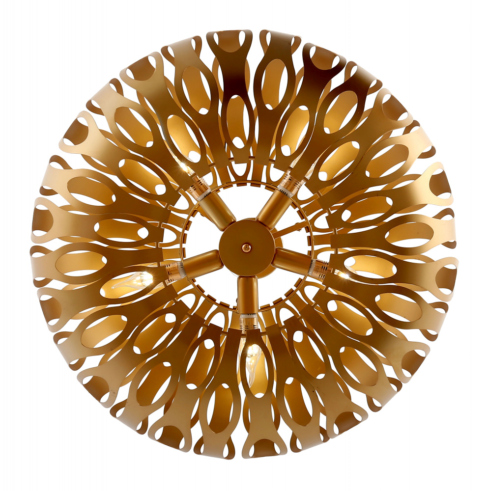Со светильниками Rivoli Mitzi комната будет наполнена воздухом, светом и стилем. Благодаря уникальному методу высокоточной лазерной резки, создателям этой серии удалось добиться невесомости металла и особой плавности линий узора. Благородный золотой цвет абажура с перламутровым напылением это солнце, навсегда поселившееся в вашем доме! Коллекция представлена подвесной люстрой на 5 ламп.