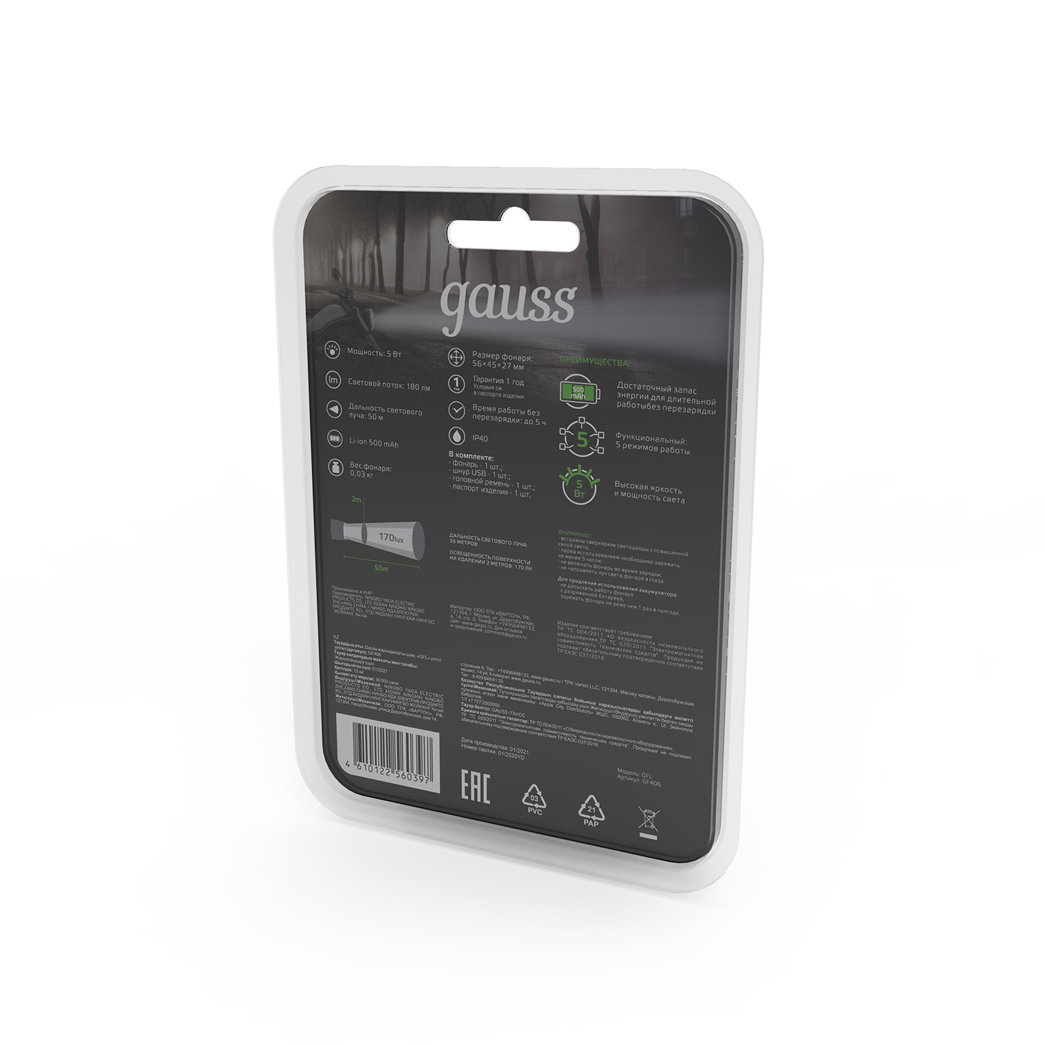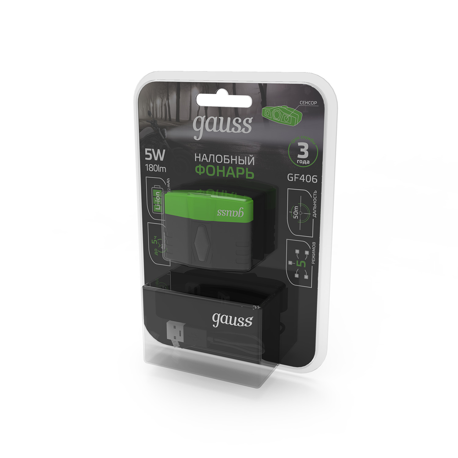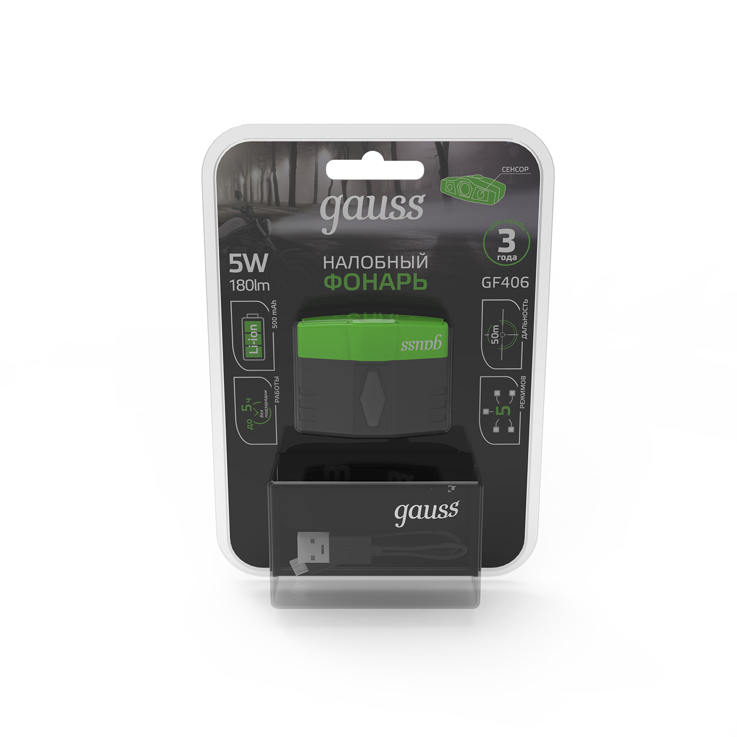 Помощь менеджераФонарь налобный Gauss GFL406 c светодиодами Cree led - это надежный яркий свет с длинной светового луча до 50 м и мощностью 180лм. На ударопрочном корпусе расположены кнопки сенсорного управления 5 режимами работы. Фонарь оснащен клипсой, дающей возможность крепления не только стандартно на голове при помощи головного ремня, но и самой клипсой на любой части одежды, ветке и прочих тонких предметах. Максимальный срок непрерывной работы - до 5 часов. Зарядка производится через стандартный USB разъем. Шнуром укомплектован.