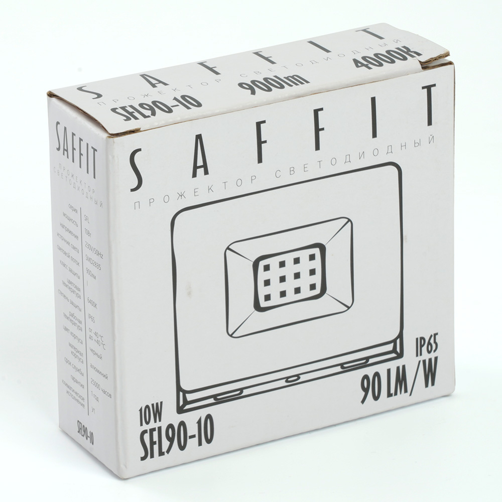 Прожектор светодиодный многоматричный с монтажным креплением на кронштейн, (ДО) SAFFIT SFL90-10, 10W, 6400К (дневной), 230V/50Гц, 900Lm, IP65, угол рассеивания 120°,*SMD2835, раб.t -40°C - +40°C, цвет черный, корпус алюминий литой под давлением + стекло, 84*66,5*27,5 мм