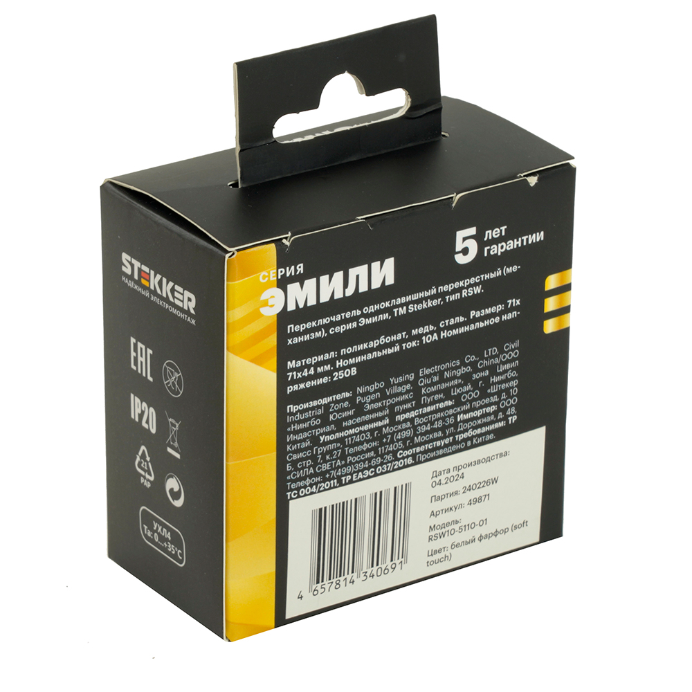 Выключатели одноклавишный STEKKER RSW10-5110-01 , серия Эмили тип установки - скрытый, размер изделия 71*71*40мм., цвет белый фарфор, soft touch, материал изделия поликарбонат, латунь, сталь. Номинальное напряжение 250 , номинальный ток 10А, 20