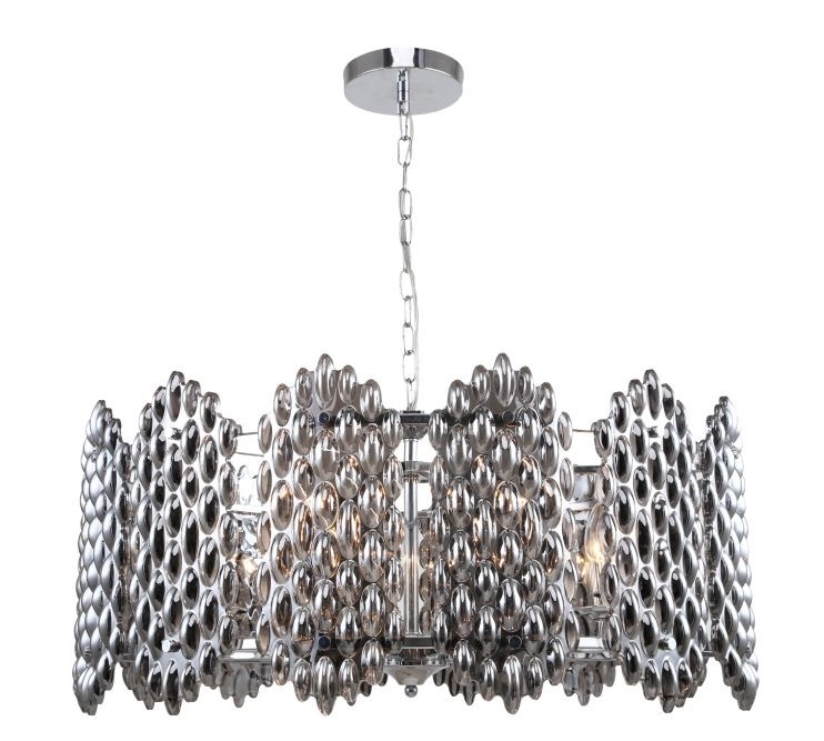 Люстра подвесная из коллекции Glazgo / Глазго выполнена из металла, гальванизированного в цвет хрома, и декорирована вертикальными фактурными стеклами дымчатого цвета.
